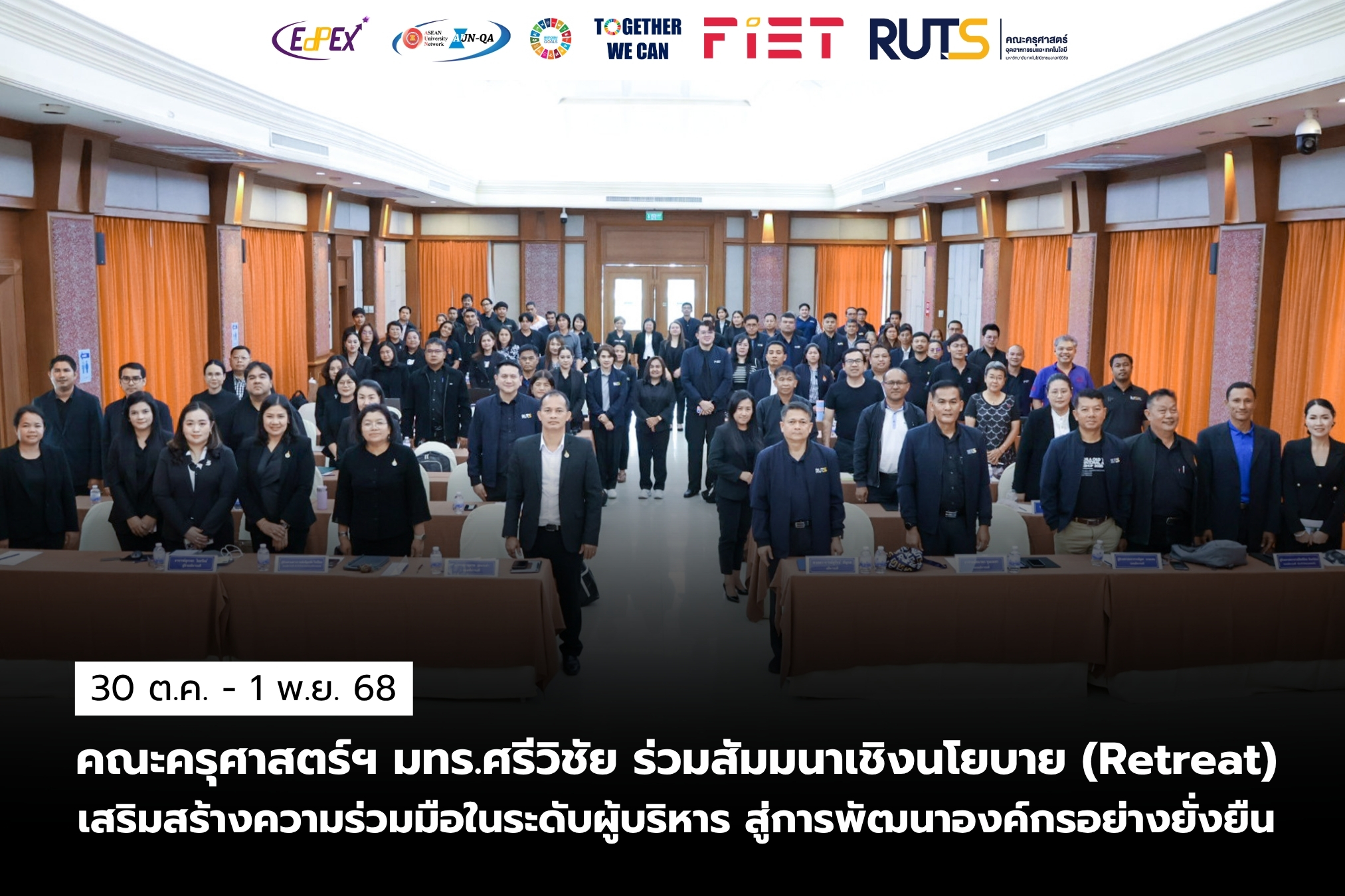 ระหว่างวันที่ 30 ตุลาคม – 1 พฤศจิกายน พ.ศ.2568 คณะครุศาสตร์อุตสาหกรรมและเทคโนโลยี นำโดย ผู้ช่วยศาสตราจารย์ไชยยะ ธนพัฒน์ศิริ คณบดีคณะครุศาสตร์อุตสาหกรรมและเทคโนโลยี พร้อมด้วยผู้บริหาร เข้าร่วม “โครงการสัมมนาเชิงนโยบาย (Retreat) ผู้บริหารมหาวิทยาลัยเทคโนโลยีราชมงคลศรีวิชัย” โดยมี ศาสตราจารย์ ดร.สุวัจน์ ธัญรส อธิการบดีมหาวิทยาลัยเทคโนโลยีราชมงคลศรีวิชัย เป็นประธาน ณ กระบี่รีสอร์ท อ่าวนาง จังหวัดกระบี่