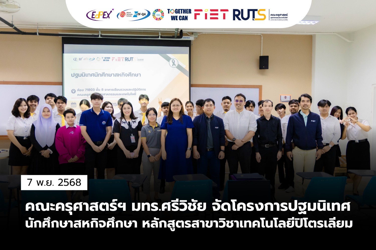 วันนี้ 7 พฤศจิกายน 2568 คณะครุศาสตร์อุตสาหกรรมและเทคโนโลยี มหาวิทยาลัยเทคโนโลยีราชมงคลศรีวิชัย จัดโครงการปฐมนิเทศนักศึกษาสหกิจศึกษา โดยได้รับเกียรติจาก ผู้ช่วยศาสตราจารย์ฤทัย ประทุมทอง หัวหน้าหน่วยฝึกประสบการณ์และสหกิจศึกษา เป็นประธานกล่าวเปิดโครงการ และ ผู้ช่วยศาสตราจารย์ ดร.นรงฤทธิ์ เสนาจิตร กล่าวรายงานวัตถุประสงค์การจัดกิจกรรม พร้อมด้วยอาจารย์ประจำหลักสูตรสาขาวิชาเทคโนโลยีปิโตรเลียม และนักศึกษาที่จะออกฝึกสหกิจศึกษา เข้าร่วมรับฟังแนวทางการเตรียมความพร้อมก่อนออกปฏิบัติงานจริงในสถานประกอบการ ณ ห้อง 71803 ชั้น 8 อาคารคณะครุศาสตร์อุตสาหกรรมและเทคโนโลยี