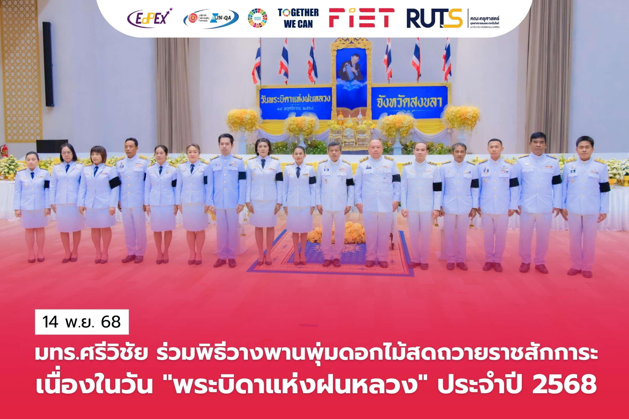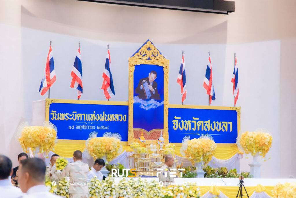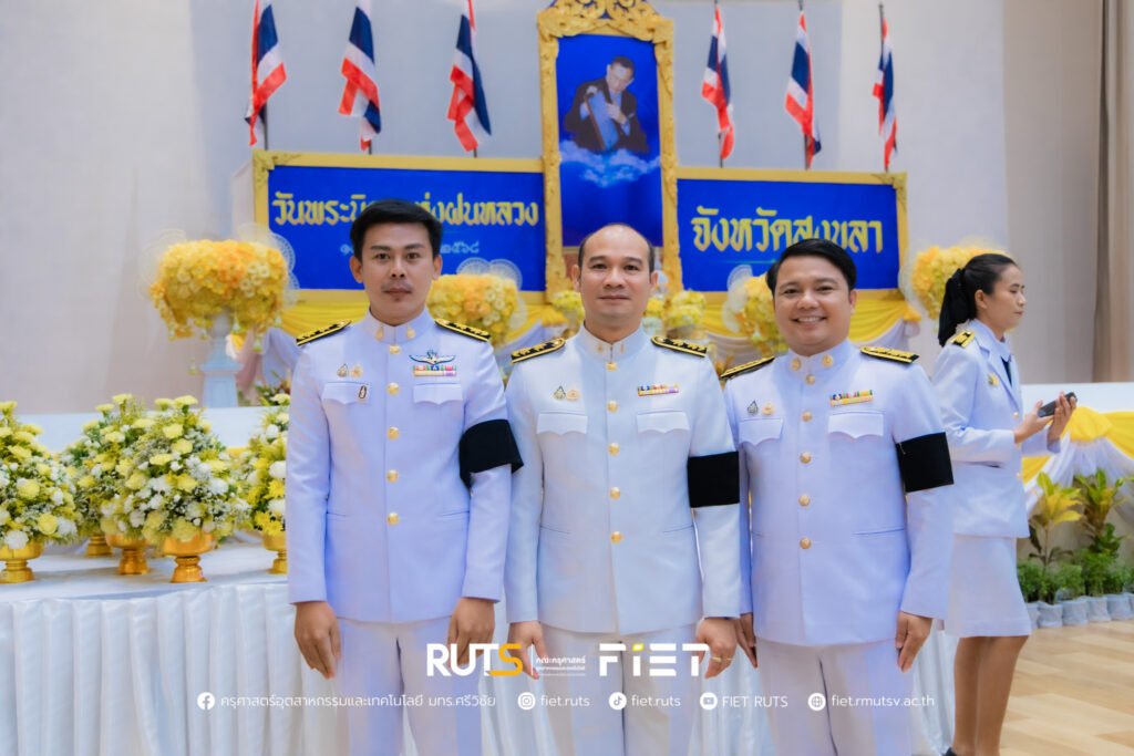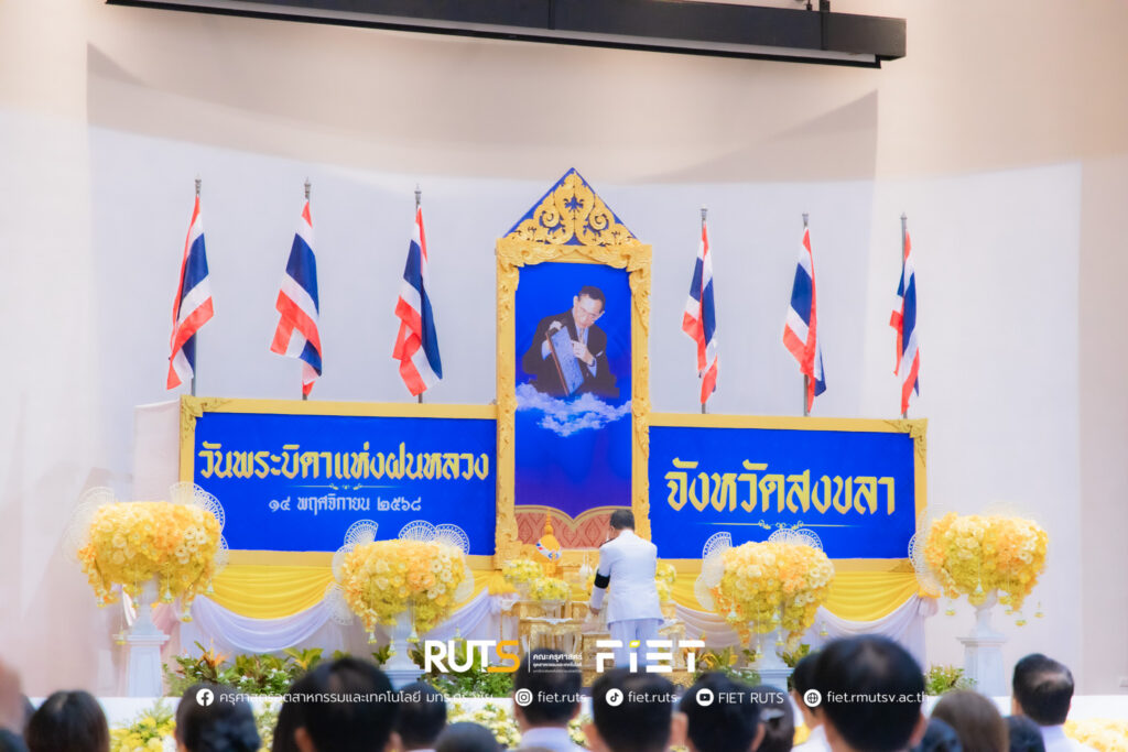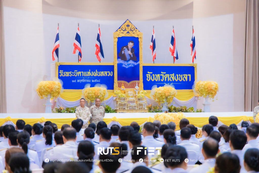 วันที่ 14 พฤศจิกายน 2568 มหาวิทยาลัยเทคโนโลยีราชมงคลศรีวิชัย โดย ผู้ช่วยศาสตราจารย์ไชยยะ ธนพัฒน์ศิริ คณบดีคณะครุศาสตร์อุตสาหกรรมและเทคโนโลยี ผู้แทนอธิการบดีมหาวิทยาลัยเทคโนโลยีราชมงคลศรีวิชัย พร้อมด้วย นายอนุกูล นันทพุธ หัวหน้าสำนักงานคณบดีคณะครุศาสตร์อุตสาหกรรมและเทคโนโลยี ร่วมพิธีวางพานพุ่มดอกไม้สดถวายราชสักการะ พระบาทสมเด็จพระมหาภูมิพลอดุลยเดชมหาราช บรมนาถบพิตร เนื่องในวันพระบิดาแห่งฝนหลวง ประจำปี 2568 โดยมี นายรัฐศาสตร์ ชิดชู ผู้ว่าราชการจังหวัดสงขลา เป็นประธานในพิธี พร้อมด้วยหัวหน้าส่วนราชการประจำจังหวัดสงขลา หน่วยงานภาครัฐ และหน่วยงานภาคเอกชน เข้าร่วม ณ หอประชุมจังหวัดสงขลา