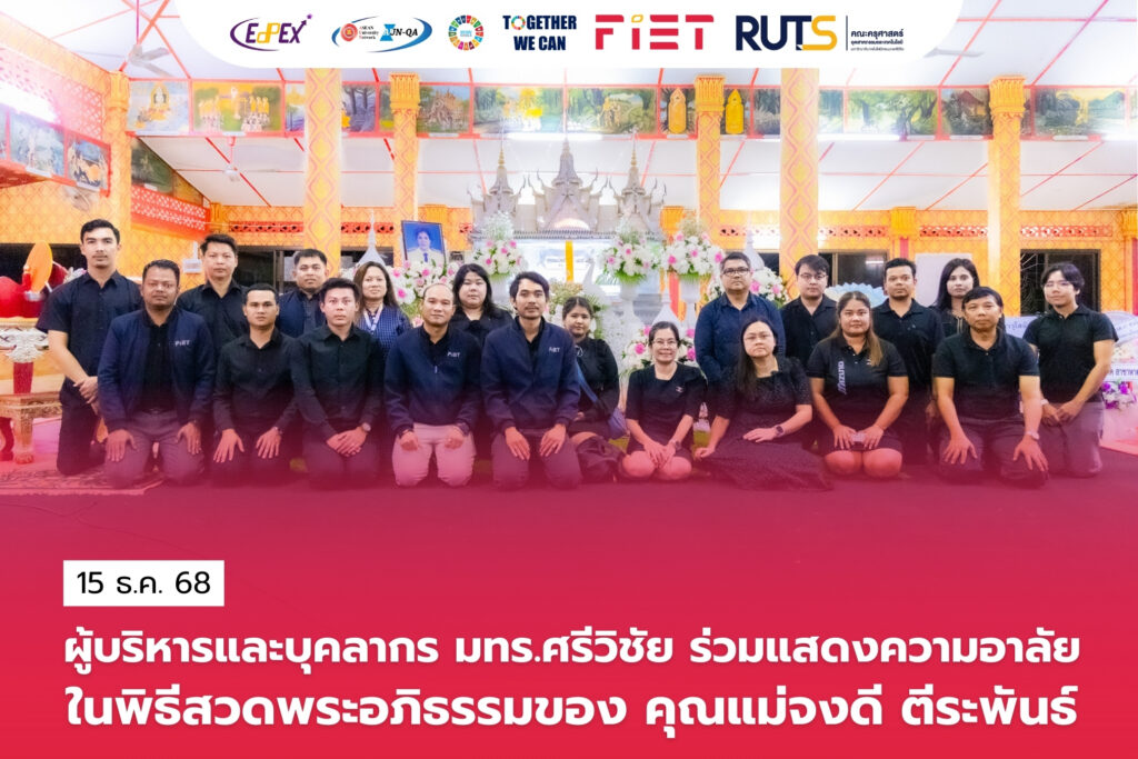วันที่ 15 ธันวาคม 2568 มหาวิทยาลัยเทคโนโลยีราชมงคลศรีวิชัย โดย ผู้ช่วยศาสตราจารย์ปิยะ ประสงค์จันทร์ รองอธิการบดีมหาวิทยาลัยเทคโนโลยีราชมงคลศรีวิชัย และ ผู้ช่วยศาสตราจารย์ไชยยะ ธนพัฒน์ศิริ คณบดีคณะครุศาสตร์อุตสาหกรรมและเทคโนโลยี พร้อมด้วยผู้บริหาร คณาจารย์ และบุคลากร เข้าร่วมพิธีสวดพระอภิธรรมของ คุณแม่จงดี ตีระพันธ์ มารดาของ อาจารย์ฐาปนิค ตีระพันธ์ อาจารย์ประจำหลักสูตรสาขาวิชาเทคโนโลยีปิโตรเลียม ณ วัดทุ่งหวังนอก ตำบลทุ่งหวัง อำเภอเมือง จังหวัดสงขลา