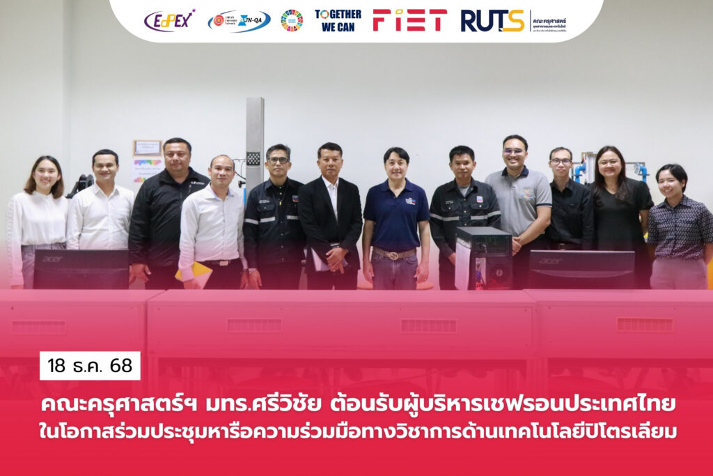 วันที่ 18 ธันวาคม 2569 มหาวิทยาลัยเทคโนโลยีราชมงคลศรีวิชัย นำโดย ผู้ช่วยศาสตราจารย์อุดร นามเสน รองอธิการบดีมหาวิทยาลัยเทคโนโลยีราชมงคลศรีวิชัย พร้อมด้วย ผู้ช่วยศาสตราจารย์ไชยยะ ธนพัฒน์ศิริ คณบดีคณะครุศาสตร์อุตสาหกรรมและเทคโนโลยี ผู้บริหาร และคณาจารย์ประจำหลักสูตรสาขาวิชาเทคโนโลยีปิโตรเลียม ร่วมให้การต้อนรับ นายกิตติพงษ์ เชิญวัฒนชัย รองประธานกรรมการบริหาร ฝ่ายปฏิบัติการ บริษัท เชฟรอนประเทศไทยสำรวจและผลิต จำกัด ณ ห้องประชุมทับทิม 1 และ ชั้น 8 หลักสูตรสาขาวิชาเทคโนโลยีปิโตรเลียม อาคารเรียนและปฏิบัติการรวมคณะครุศาสตร์อุตสาหกรรมและเทคโนโลยี มทร.ศรีวิชัย