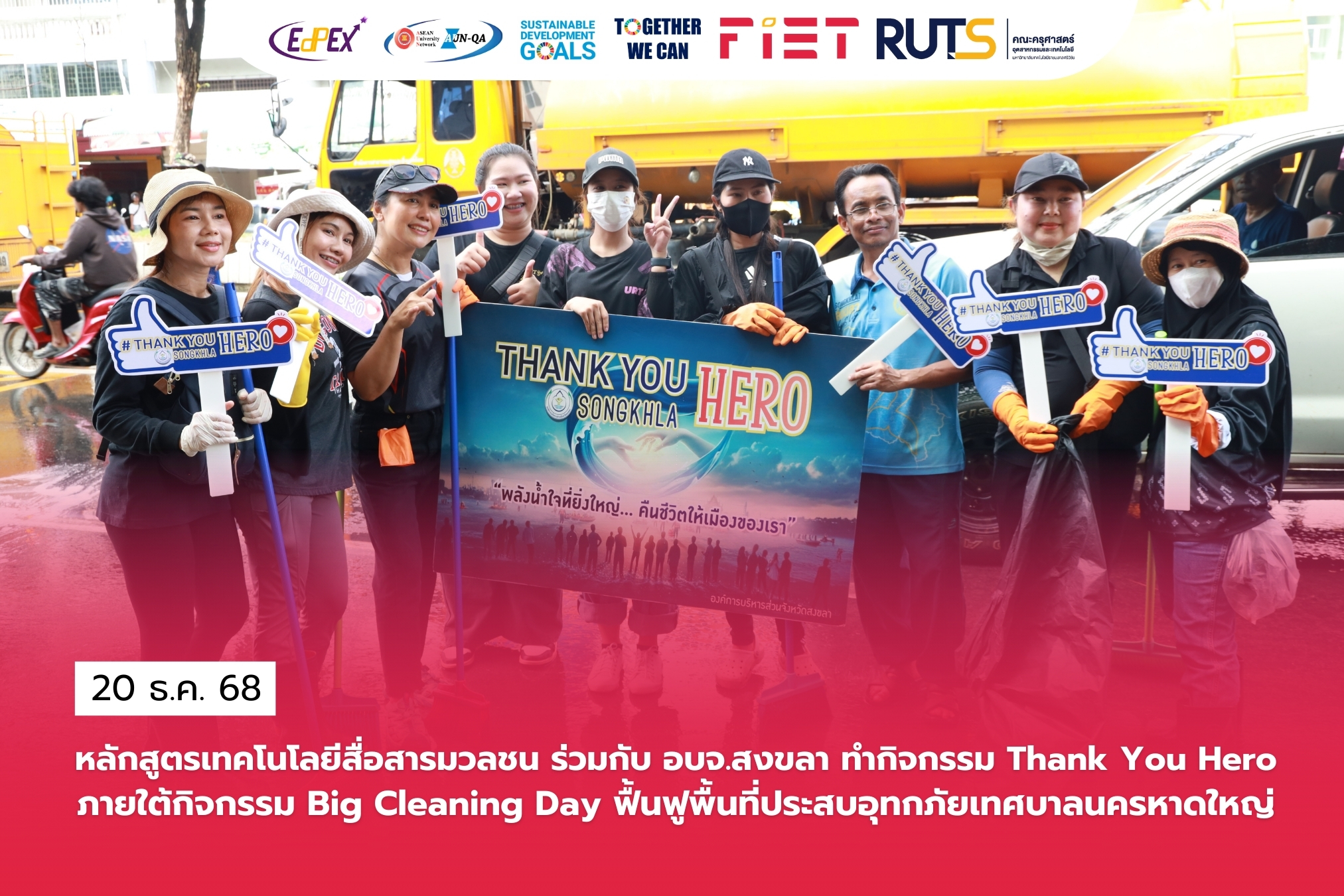 วันที่ 20 ธันวาคม 2568 หลักสูตรสาขาวิชาเทคโนโลยีสื่อสารมวลชน คณะครุศาสตร์อุตสาหกรรมและเทคโนโลยี มหาวิทยาลัยเทคโนโลยีราชมงคลศรีวิชัย ร่วมกับองค์การบริหารส่วนจังหวัดสงขลา ในการทำกิจกรรม “Thank You Hero” ภายใต้กิจกรรม Big Cleaning Day ฟื้นฟูพื้นที่ประสบภัย ในเขตเทศบาลนครหาดใหญ่ จังหวัดสงขลา โดยมีอาจารย์และนักศึกษาเข้าร่วมกิจกรรม