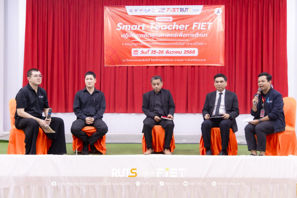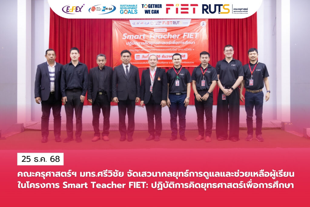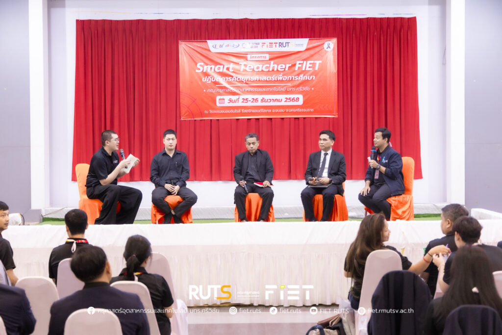 วันที่ 25 ธันวาคม 2568 คณะครุศาสตร์อุตสาหกรรมและเทคโนโลยี มหาวิทยาลัยเทคโนโลยีราชมงคลศรีวิชัย จัดกิจกรรมเสวนาในหัวข้อ “กลยุทธ์ในการดูแลและช่วยเหลือผู้เรียน” ภายใต้โครงการ Smart Teacher FIET: ปฏิบัติการคิดยุทธศาสตร์เพื่อการศึกษา ณ โรงแรมขนอมซันไรส์ รีสอร์ทแอนด์โฮเทล อำเภอขนอม จังหวัดนครศรีธรรมราช