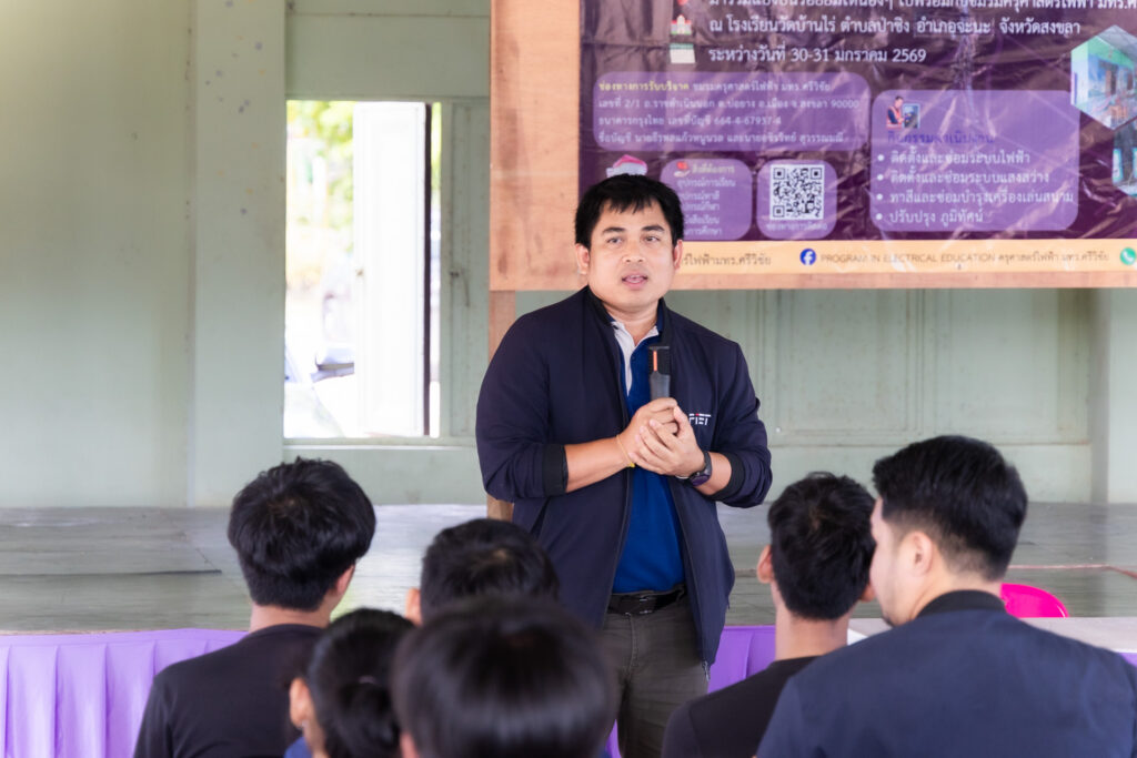 วันที่ 30 มกราคม พ.ศ. 2569 ชมรมครุศาสตร์ไฟฟ้า มหาวิทยาลัยเทคโนโลยีราชมงคลศรีวิชัย จัดโครงการ “ครุศาสตร์ไฟฟ้าพัฒนาเพื่อน้อง สร้างความปรองดองสู่ชุมชน ครั้งที่ 4” โดยได้รับเกียรติจาก ผู้ช่วยศาสตราจารย์ไชยยะ ธนพัฒนศิริ คณบดีคณะครุศาสตร์อุตสาหกรรมและเทคโนโลยี เป็นประธานในพิธีเปิดโครงการ ณ โรงเรียนวัดบ้านไร่ ตำบลป่าชิง อำเภอจะนะ จังหวัดสงขลา