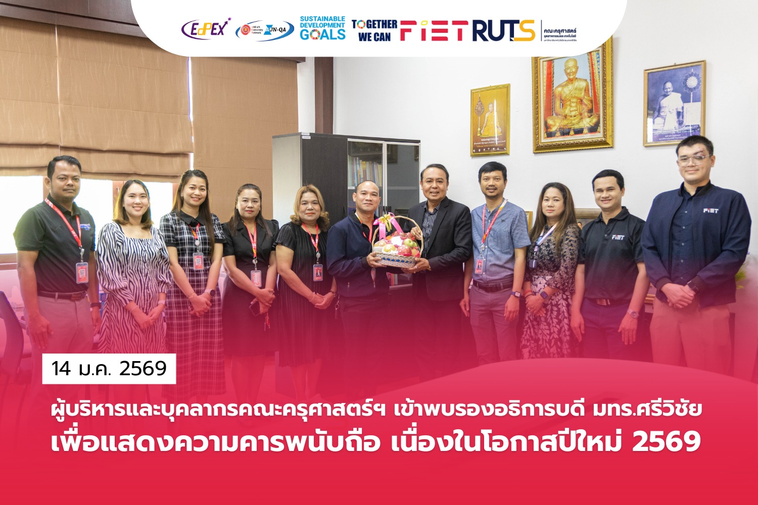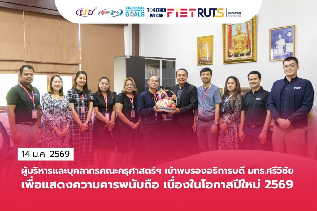 วันที่ 14 มกราคม 2569 ผู้ช่วยศาสตราจารย์ไชยยะ ธนพัฒน์ศิริ คณบดีคณะครุศาสตร์อุตสาหกรรมและเทคโนโลยี มทร.ศรีวิชัย พร้อมด้วยคณะผู้บริหารและบุคลากรของคณะฯ เดินทางเข้าพบ ผู้ช่วยศาสตราจารย์ปิยะ ประสงค์จันทร์ รองอธิการบดี มทร.ศรีวิชัย เนื่องในโอกาสเทศกาลปีใหม่ พ.ศ. 2569 ณ สำนักงานอธิการบดี มหาวิทยาลัยเทคโนโลยีราชมงคลศรีวิชัย