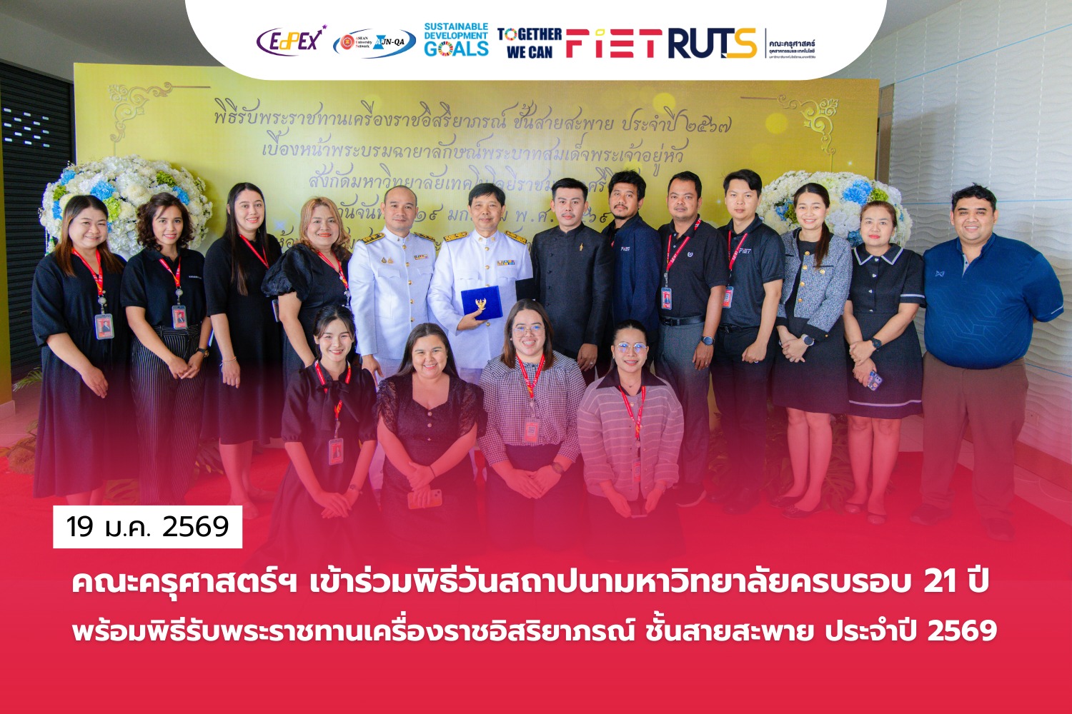 วันนี้ 19 มกราคม 2569 คณะครุศาสตร์อุตสาหกรรมและเทคโนโลยี มทร.ศรีวิชัย มทร.ศรีวิชัย เข้าร่วมพิธีวันสถาปนามหาวิทยาลัยครบรอบ 21 ปี พร้อมพิธีรับพระราชทานเครื่องราชอิสริยาภรณ์ ชั้นสายสะพาย ประจำปี 2569” ณ ห้องประชุมชูพันธ์ คณะครุศาสตร์อุตสาหกรรมและเทคโนโลยี เพื่อย้อนรำลึกถึงจุดเริ่มต้นของมหาวิทยาลัยฯ นับตั้งแต่ปี พ.ศ. 2548 และร่วมกันก้าวสู่ทศวรรษที่ 3 ในฐานะสถาบันอุดมศึกษาชั้นนำด้านนวัตกรรมและเทคโนโลยีของภาคใต้ ในโอกาสนี้ ศาสตราจารย์ ดร.สุวัจน์ ธัญรส อธิการบดี มอบหมายให้ ผู้ช่วยศาสตราจารย์ปิยะ ประสงค์จันทร์ รองอธิการบดี เป็นประธานในพิธี โดยมีคณะผู้บริหาร คณาจารย์ บุคลากร และนักศึกษาเข้าร่วมกิจกรรมสำคัญประกอบด้วย
