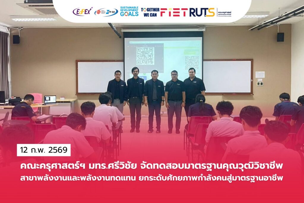 เมื่อวันที่ 12 กุมภาพันธ์ 2569 คณะครุศาสตร์อุตสาหกรรมและเทคโนโลยี มทร.ศรีวิชัย จัดโครงการทดสอบมาตรฐานคุณวุฒิวิชาชีพเพื่อรับรองสมรรถนะของบุคคลตามมาตรฐานอาชีพ สาขาวิชาชีพพลังงานและพลังงานทดแทน โดยจัดกิจกรรมที่ 2 การทดสอบสมรรถนะอาชีพ “ผู้ปฏิบัติงานตรวจวัดพลังงานไฟฟ้า ระดับ 3” ณ ห้อง 71507 อาคารเรียนรวมคณะครุศาสตร์อุตสาหกรรมและเทคโนโลยี