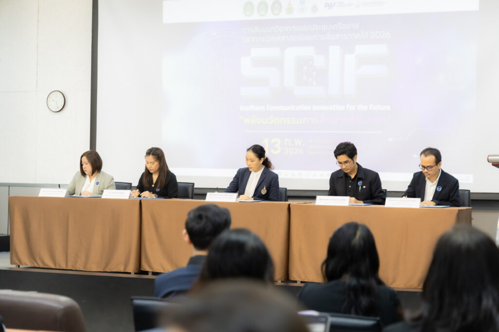 วันที่ 13 กุมภาพันธ์ 2569 หลักสูตรสาขาวิชาเทคโนโลยีสื่อสารมวลชน คณะครุศาสตร์อุตสาหกรรมและเทคโนโลยี นำโดย ผู้ช่วยศาสตราจารย์จักรกฤษฎ์ แก้วประเสริฐ ประธานหลักสูตรสาขาวิชาเทคโนโลยีสื่อสารมวลชน พร้อมด้วยคณาจารย์และนักศึกษา เข้าร่วมการสัมมนาวิชาการและประชุมเครือข่าย “วิชาการนิเทศศาสตร์และการสื่อสารภาคใต้ 2026 : พลังนวัตกรรมการสื่อสารสู่อนาคต (Southern Communication Innovation for the Future: SCIF)” ณ คณะวิทยาการสื่อสาร มหาวิทยาลัยสงขลานครินทร์ วิทยาเขตปัตตานี