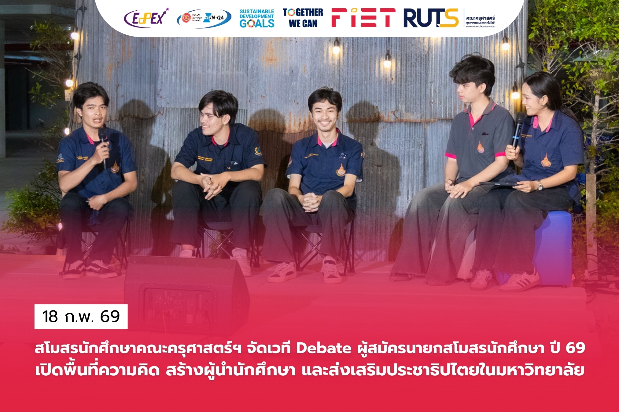 วันที่ 18 กุมภาพันธ์ 2569 สโมสรนักศึกษาคณะครุศาสตร์อุตสาหกรรมและเทคโนโลยี มหาวิทยาลัยเทคโนโลยีราชมงคลศรีวิชัย จัดกิจกรรมเปิดเวที Debate ผู้สมัครนายกสโมสรนักศึกษา ประจำปีการศึกษา 2569 เพื่อเป็นเวทีให้นักศึกษาได้แสดงวิสัยทัศน์ แนวคิด และนโยบายในการพัฒนาคณะ ตลอดจนเปิดโอกาสให้นักศึกษาทั่วไปได้รับฟังข้อมูลประกอบการตัดสินใจเลือกตั้งผู้นำนักศึกษาในบรรยากาศที่เปิดกว้าง โปร่งใส และสร้างสรรค์ ณ สวน Smart Garden นัดในสวน RUTS Walking Street มหาวิทยาลัยเทคโนโลยีราชมงคลศรีวิชัย