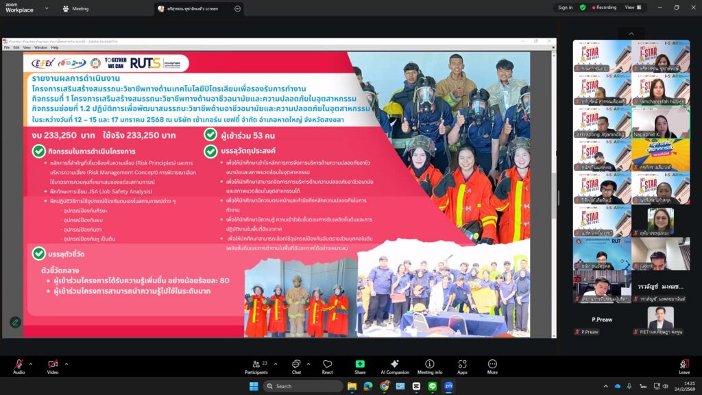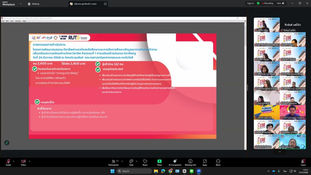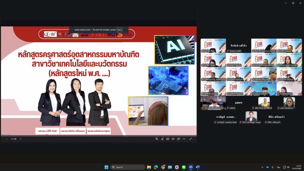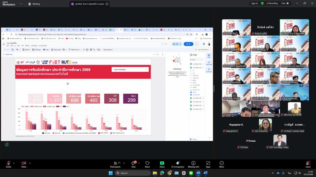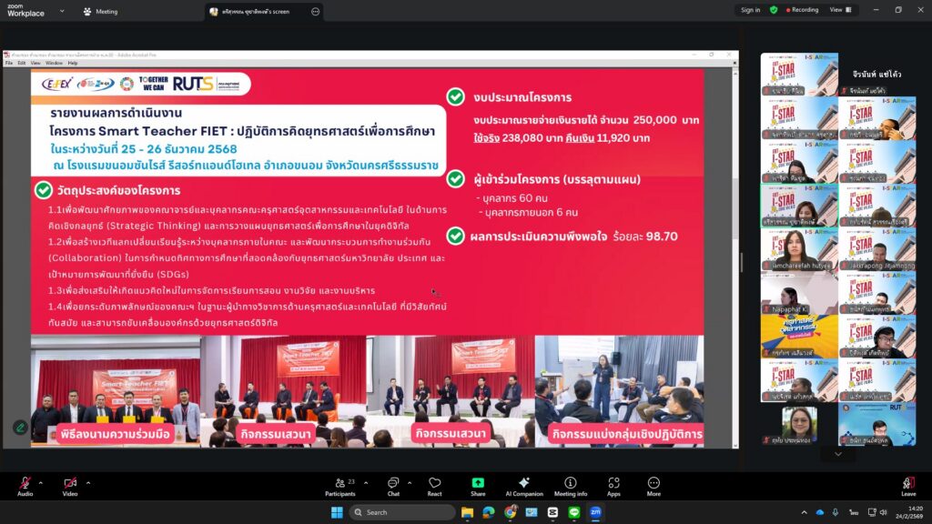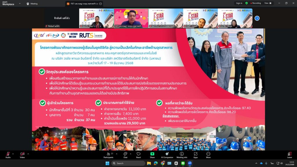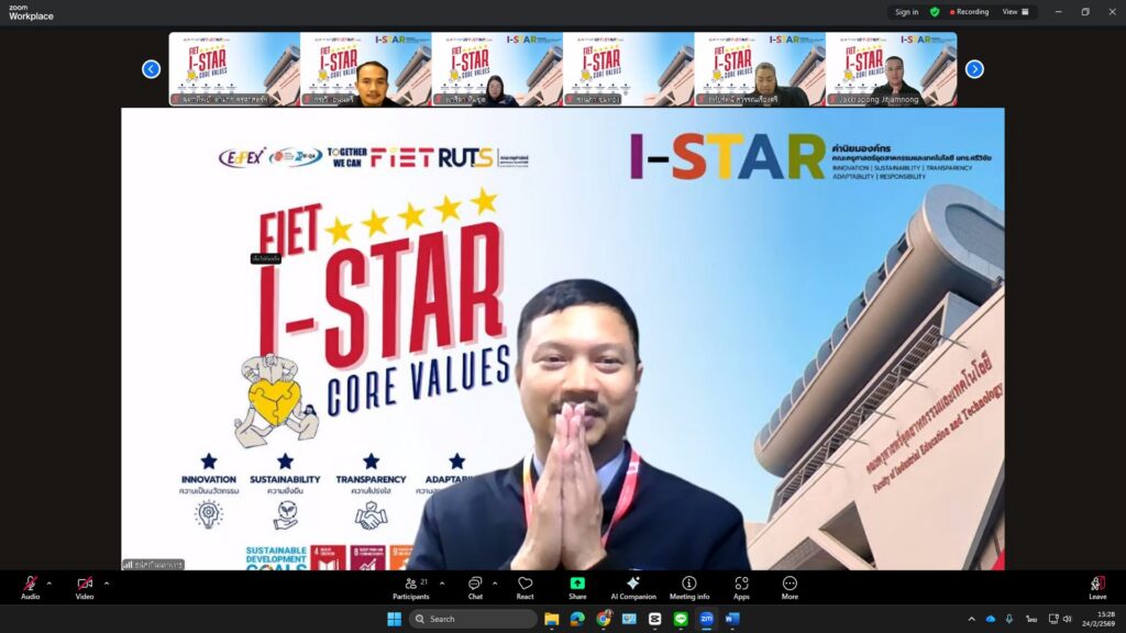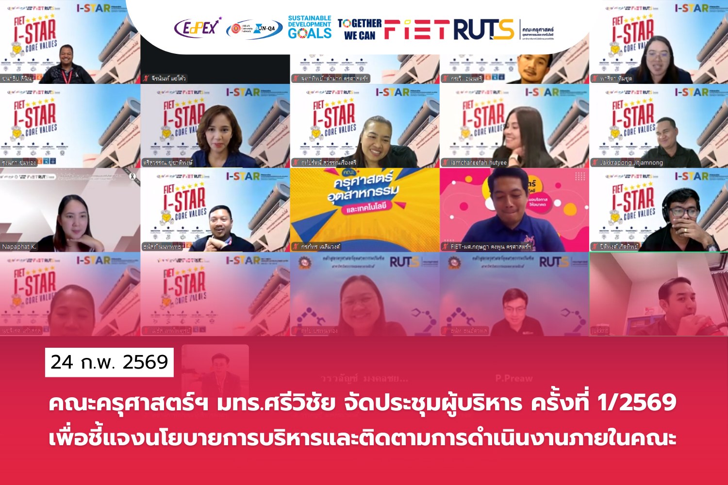 วันที่ 24 กุมภาพันธ์ 2569 คณะครุศาสตร์อุตสาหกรรมและเทคโนโลยี มหาวิทยาลัยเทคโนโลยีราชมงคลศรีวิชัย จัดการประชุมผู้บริหารคณะ ครั้งที่ 1/2569 โดยผู้ช่วยศาสตราจารย์ไชยยะ ธนพัฒน์ศิริ คณบดีคณะครุศาสตร์อุตสาหกรรมและเทคโนโลยี มอบหมายให้รองศาสตราจารย์ ดร.ธนัสถ์ นนทพุทธ รองคณบดีฝ่ายวิชาการและวิจัย เป็นประธานการประชุม พร้อมด้วยผู้บริหารและบุคลากรเข้าร่วมการประชุมผ่านระบบออนไลน์ Zoom Cloud Meetings