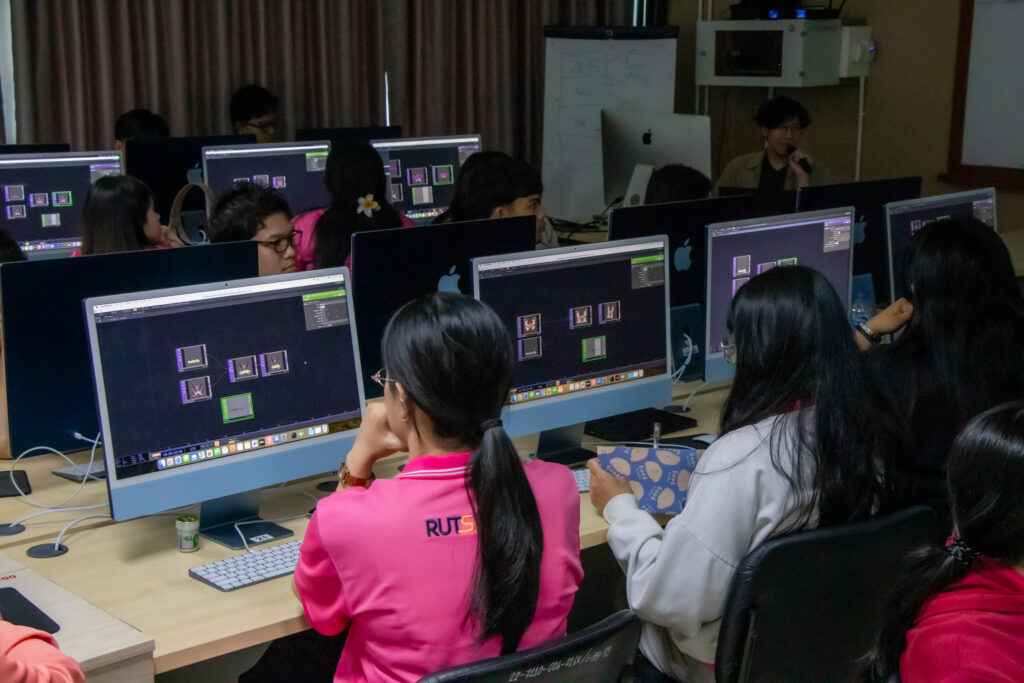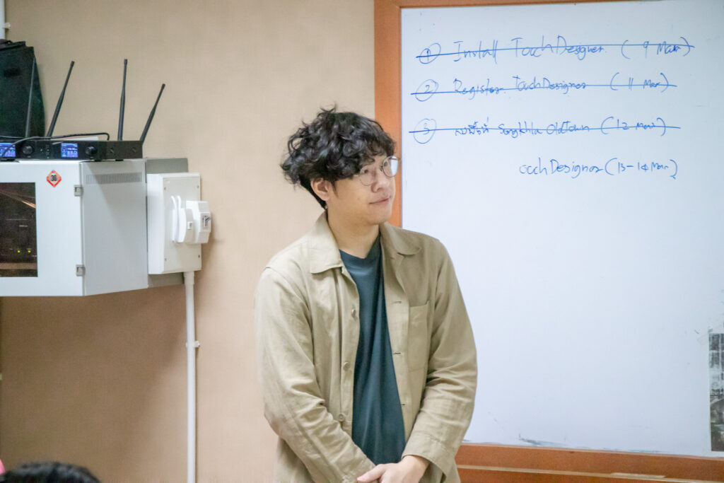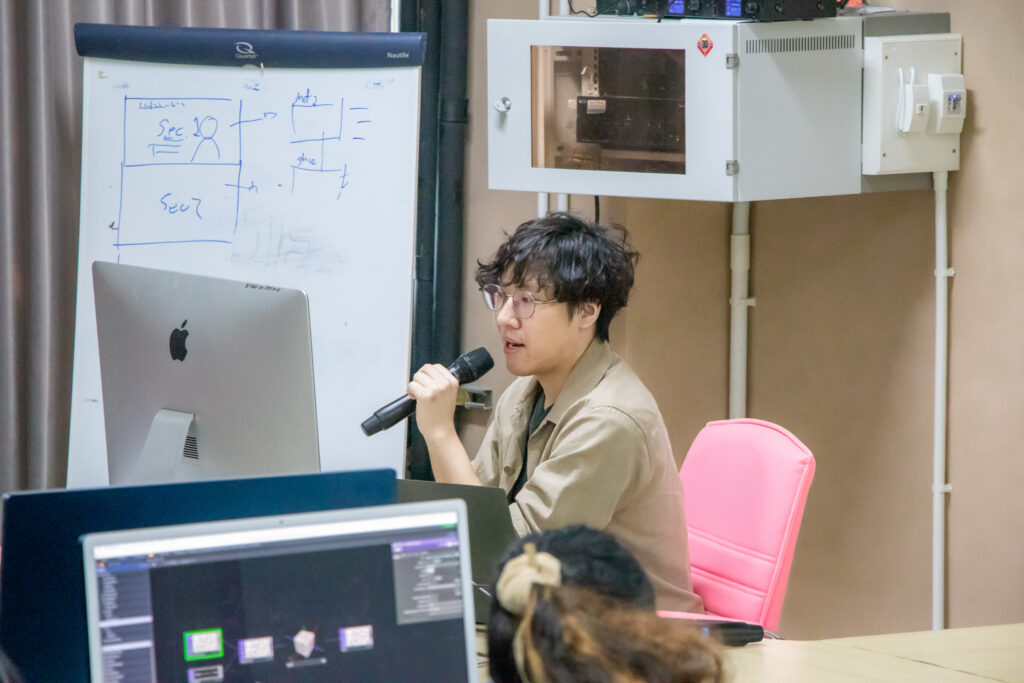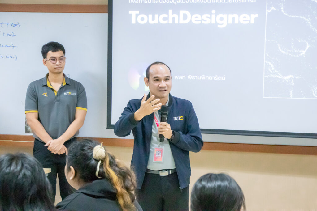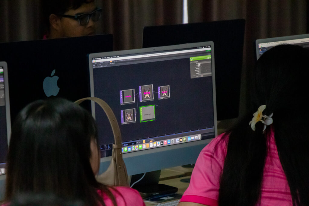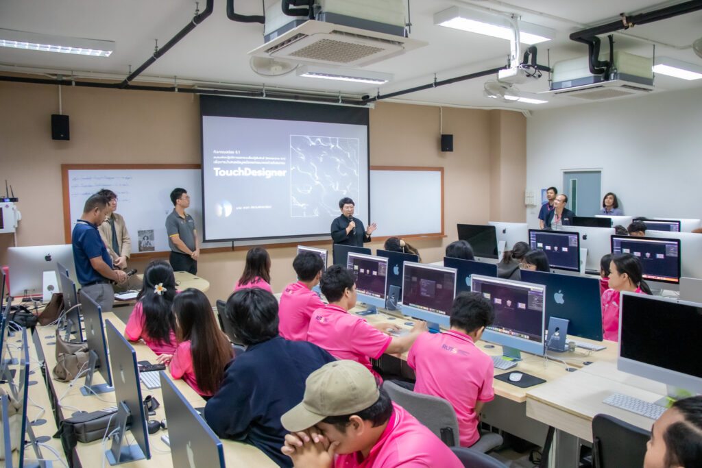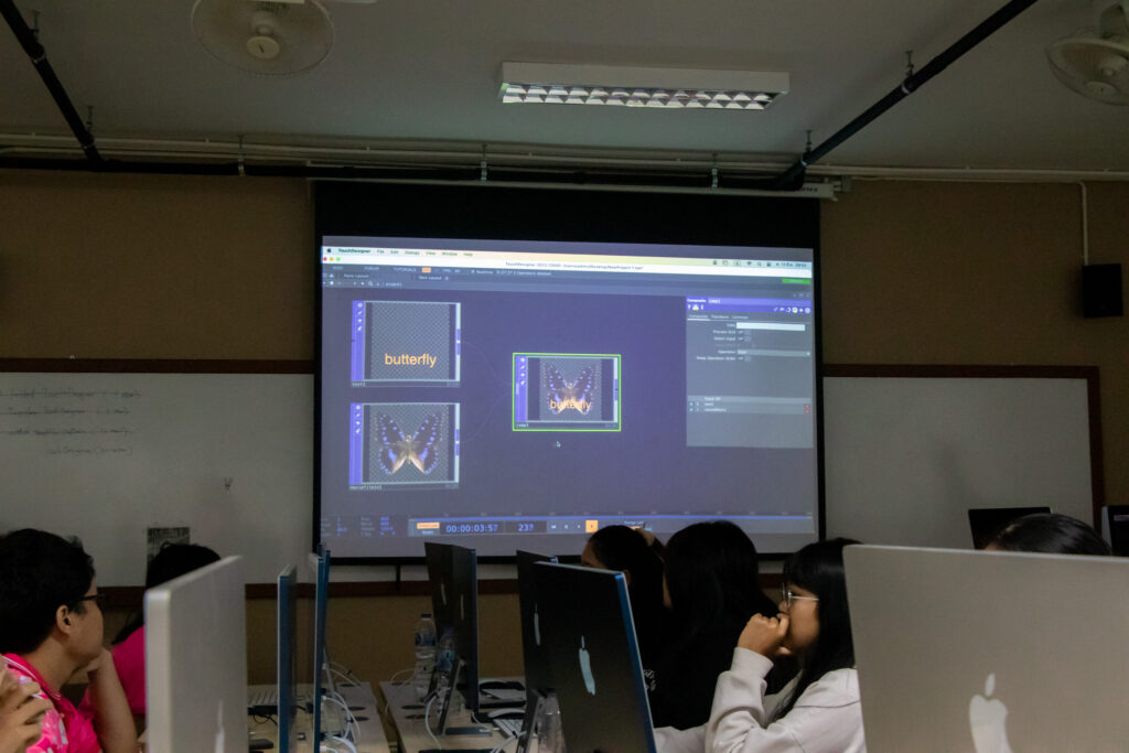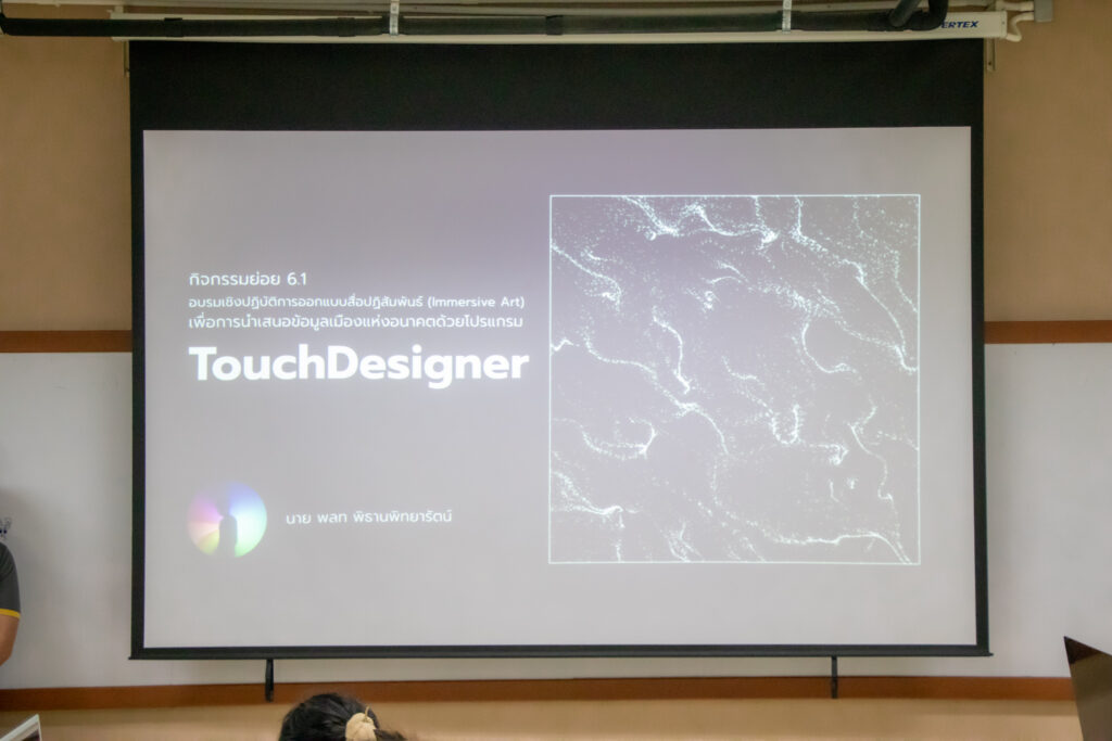 ภายในกิจกรรมได้รับเกียรติจากคุณพลท พิธานพิทยารัตน์ วิทยากร ให้ความรู้ในด้านการออกแบบสื่อปฏิสัมพันธ์และการสร้างสรรค์สื่อดิจิทัลด้วยโปรแกรม TouchDesigner หลักการเบื้องต้นของ Visual Programming และการใช้งานโปรแกรม TouchDesigner การทำความเข้าใจโครงสร้าง Operator ทั้ง 5 ประเภท ได้แก่ TOP, CHOP, SOP, DAT และ COMP รวมถึงการบริหารจัดการสัญญาณและการเชื่อมต่อโหนด (Signal Flow and Linkage) จากนั้นเป็นการเรียนรู้การใช้เครื่องมือพื้นฐานของโปรแกรมเพื่อจัดการสัญญาณและระบบการทำงานของโหนด การเรียนรู้กระบวนการ สร้างสรรค์ทัศนภาพจากอัลกอริทึม (Generative Visuals) อาทิ การสร้าง Noise และ Feedback Loop เพื่อพัฒนารูปแบบงานทัศนศิลป์ดิจิทัล รวมถึงการวิเคราะห์และปรับเปลี่ยนค่าพารามิเตอร์ (Parameter Modulation) เพื่อควบคุมรูปแบบการแสดงผลของภาพอย่างสร้างสรรค์