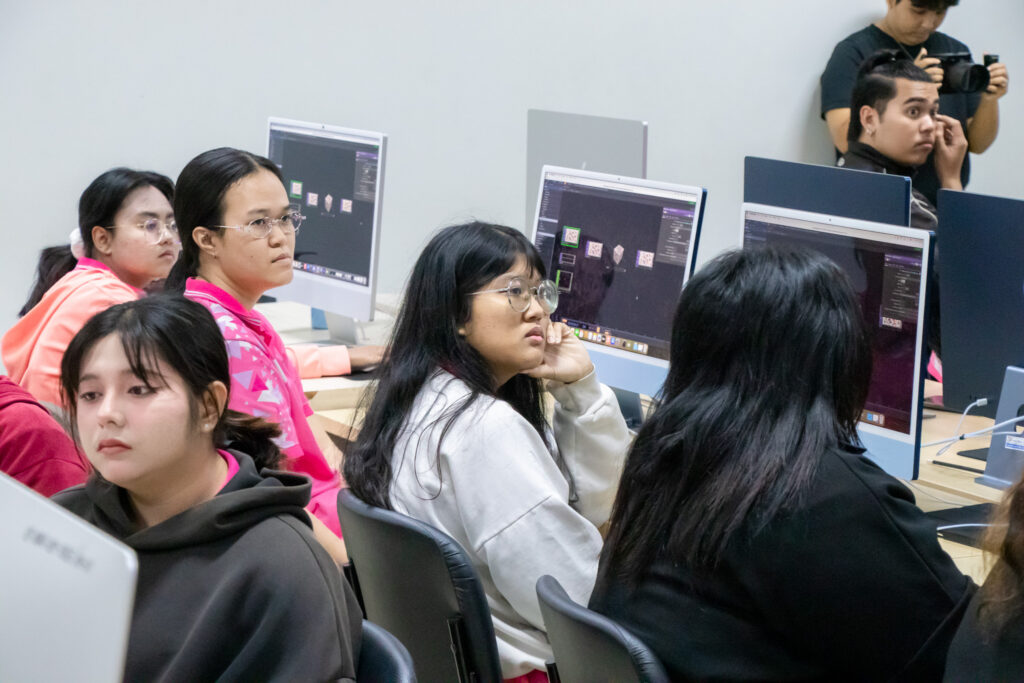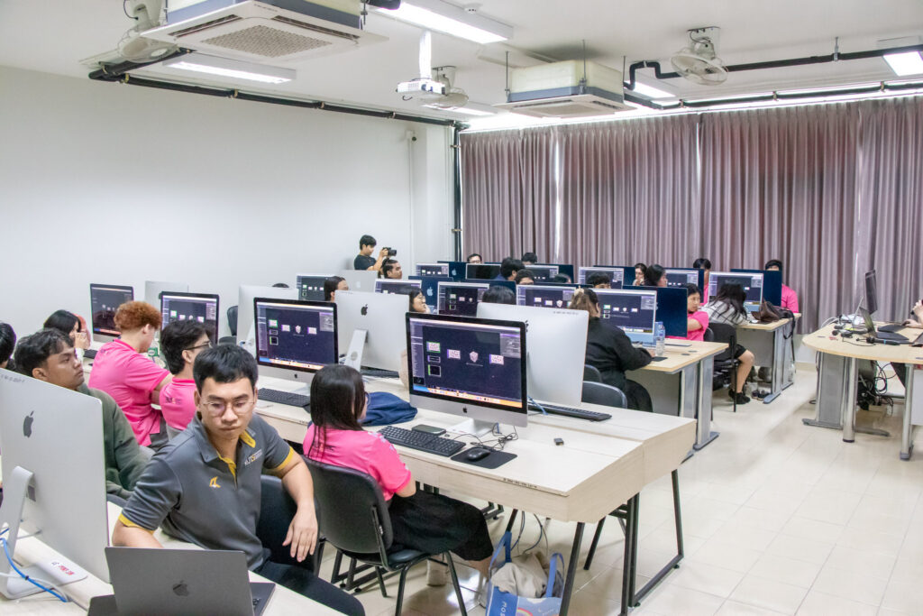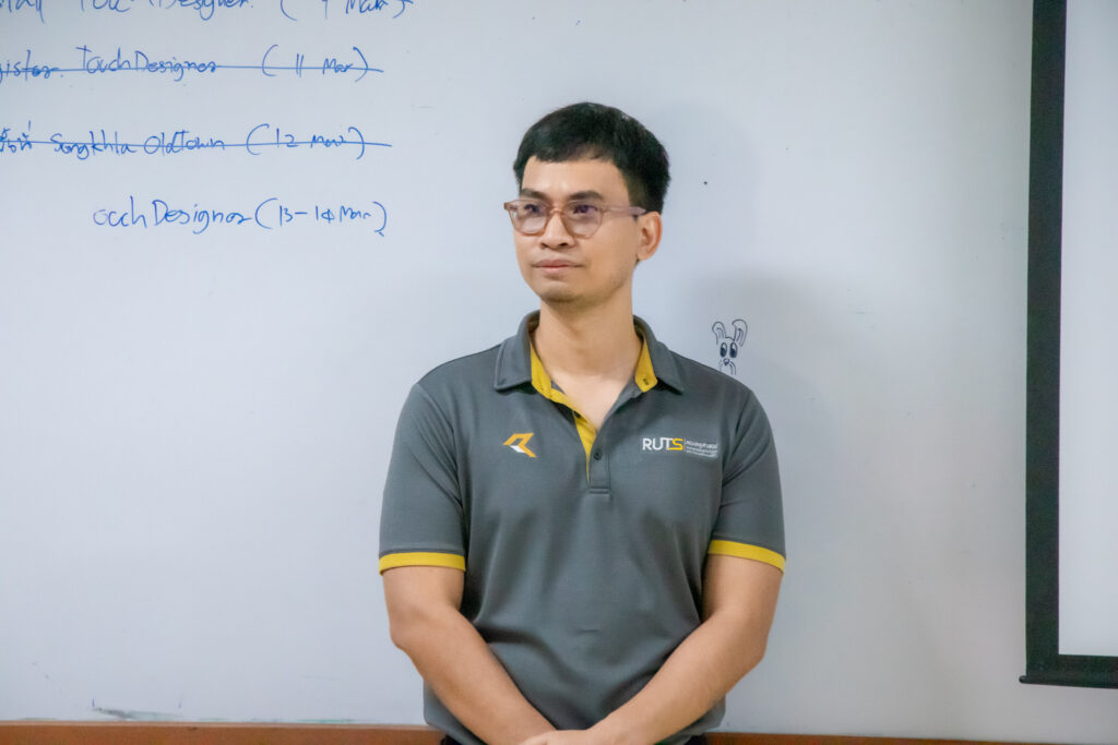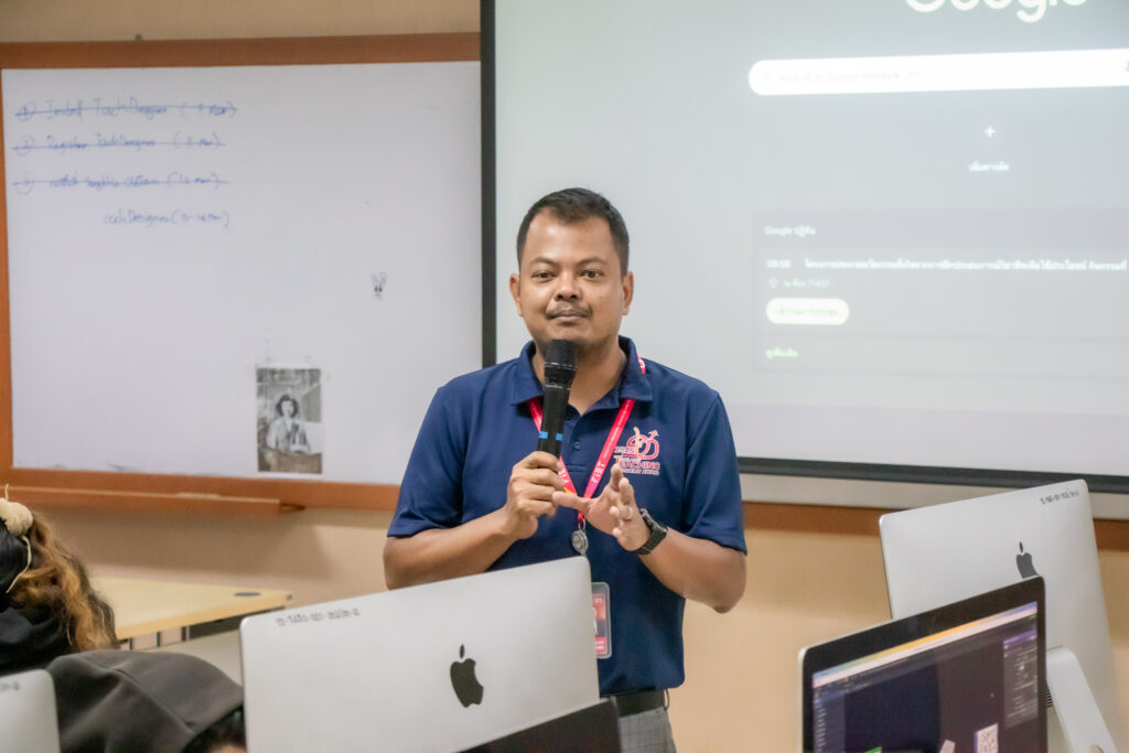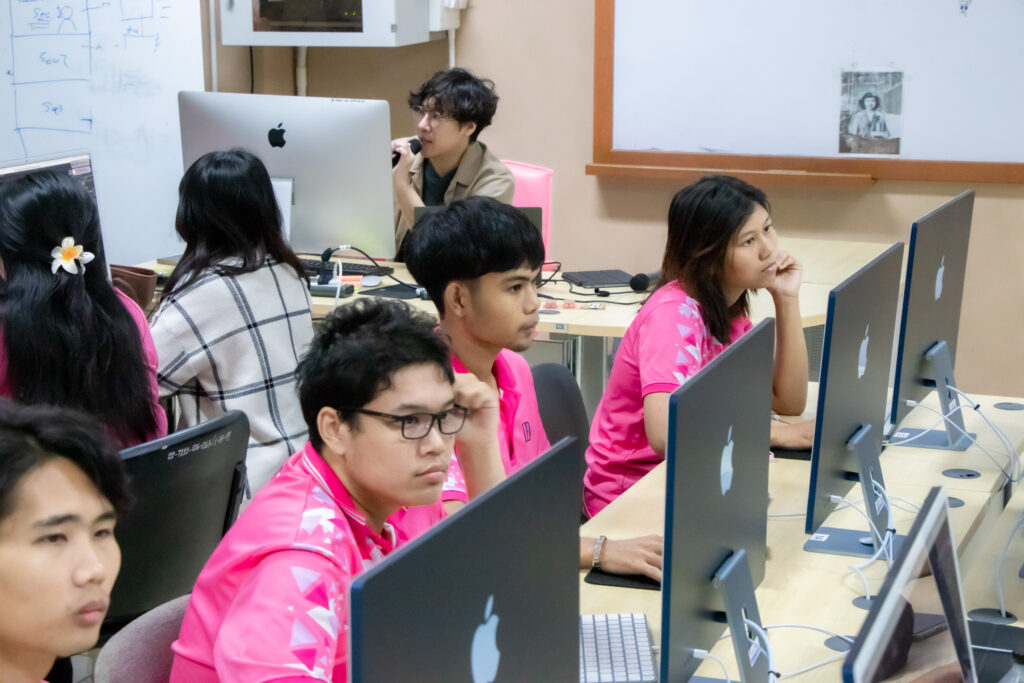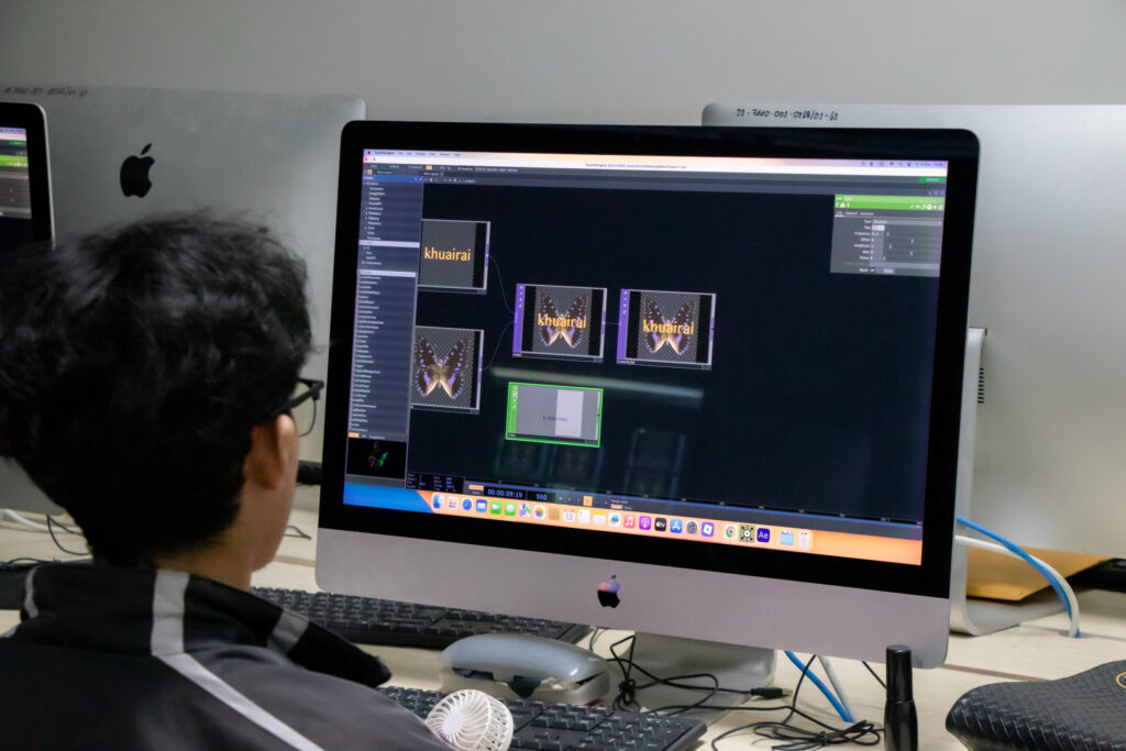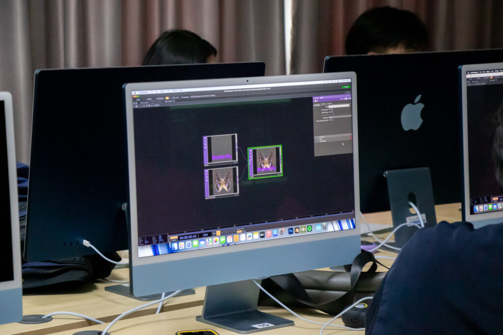ภายในกิจกรรมได้รับเกียรติจากคุณพลท พิธานพิทยารัตน์ วิทยากร ให้ความรู้ในด้านการออกแบบสื่อปฏิสัมพันธ์และการสร้างสรรค์สื่อดิจิทัลด้วยโปรแกรม TouchDesigner หลักการเบื้องต้นของ Visual Programming และการใช้งานโปรแกรม TouchDesigner การทำความเข้าใจโครงสร้าง Operator ทั้ง 5 ประเภท ได้แก่ TOP, CHOP, SOP, DAT และ COMP รวมถึงการบริหารจัดการสัญญาณและการเชื่อมต่อโหนด (Signal Flow and Linkage) จากนั้นเป็นการเรียนรู้การใช้เครื่องมือพื้นฐานของโปรแกรมเพื่อจัดการสัญญาณและระบบการทำงานของโหนด การเรียนรู้กระบวนการ สร้างสรรค์ทัศนภาพจากอัลกอริทึม (Generative Visuals) อาทิ การสร้าง Noise และ Feedback Loop เพื่อพัฒนารูปแบบงานทัศนศิลป์ดิจิทัล รวมถึงการวิเคราะห์และปรับเปลี่ยนค่าพารามิเตอร์ (Parameter Modulation) เพื่อควบคุมรูปแบบการแสดงผลของภาพอย่างสร้างสรรค์