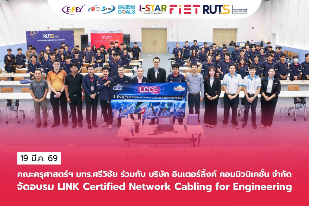 วันที่ 19 มีนาคม 2569 คณะครุศาสตร์อุตสาหกรรมและเทคโนโลยี มหาวิทยาลัยเทคโนโลยีราชมงคลศรีวิชัย โดย ผู้ช่วยศาสตราจารย์ไชยยะ ธนพัฒน์ศิริ คณบดีคณะครุศาสตร์อุตสาหกรรมและเทคโนโลยี ให้เกียรติเป็นประธานเปิดโครงการ “LINK Certified Network Cabling for Engineering” พร้อมด้วยคณะผู้บริหาร อาจารย์ บุคลากร และนักศึกษา จากหลักสูตรสาขาวิชาระบบโทรคมนาคมและเครือข่าย (ต่อเนื่อง) และหลักสูตรสาขาวิชาวิศวกรรมไฟฟ้า เข้าร่วม ณ ห้องประชุมชูพันธ์ คณะครุศาสตร์อุตสาหกรรมและเทคโนโลยี