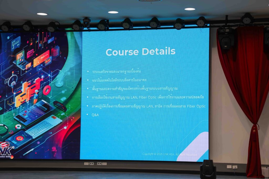 ภายในกิจกรรม นักศึกษาได้รับการถ่ายทอดองค์ความรู้จากทีมวิศวกรผู้เชี่ยวชาญด้านระบบสายสัญญาณและอุปกรณ์เน็ตเวิร์กของบริษัทฯ ซึ่งได้ลงพื้นที่จัดการฝึกอบรมโดยไม่มีค่าใช้จ่าย พร้อมทั้งแนะนำเทคนิคการทำงานจริงในสายอาชีพ เพื่อเตรียมความพร้อมสู่การเป็นวิศวกรด้านเครือข่ายในอนาคต