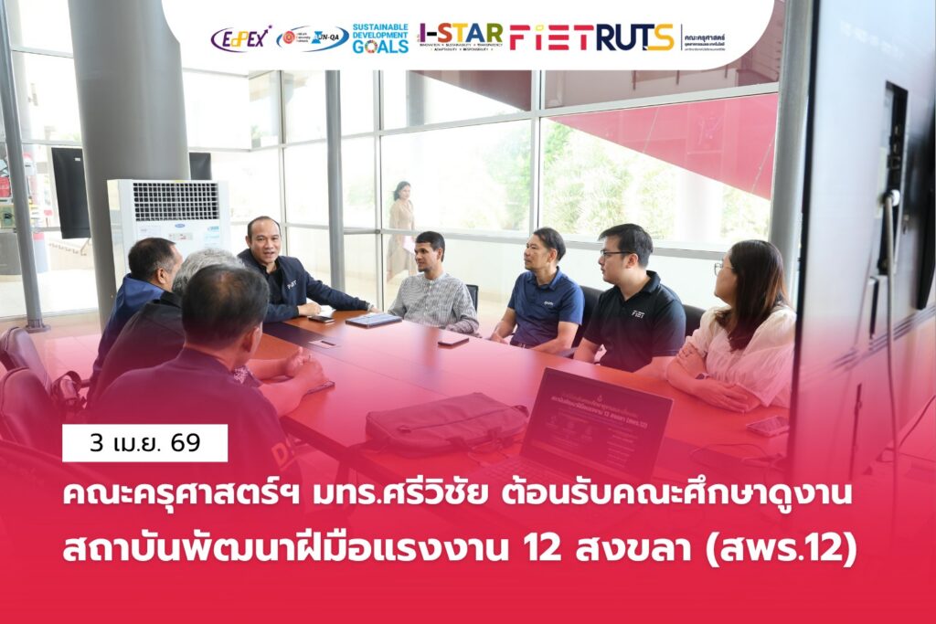 วันนี้ 3 เมษายน 2569 คณะครุศาสตร์อุตสาหกรรมและเทคโนโลยี มทร.ศรีวิชัย ต้อนรับคณะศึกษาดูงานจาก สถาบันพัฒนาฝีมือแรงงาน 12 สงขลา (สพร.12) ในโอกาสเข้าศึกษาดูงานและแลกเปลี่ยนเรียนรู้ด้านการจัดการเรียนการสอนและการพัฒนากำลังคนด้านเทคโนโลยี การศึกษาดูงานในครั้งนี้จัดขึ้น ณ ห้องประชุม สำนักงานคณบดี คณะครุศาสตร์อุตสาหกรรมและเทคโนโลยี โดยมีวัตถุประสงค์เพื่อเสริมสร้างความร่วมมือทางวิชาการ แลกเปลี่ยนองค์ความรู้ และยกระดับมาตรฐานการพัฒนาฝีมือแรงงานร่วมกัน