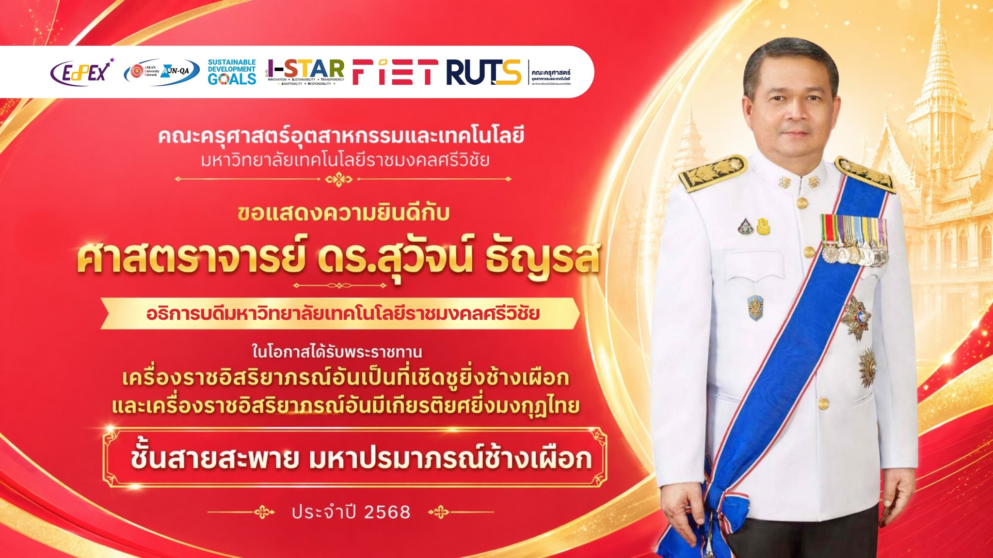 ขอแสดงความยินดี อธิการบดีมหาวิทยาลัยเทคโนโลยีราชมงคลศรีวิชัย ในโอกาสได้รับพระราชทานเครื่องราชอิสริยาภรณ์